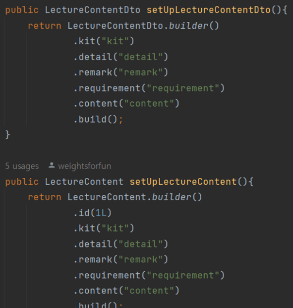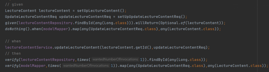 그 이후 서비스의 한 메서드인 createLectureContent를 테스트를 하였다.
