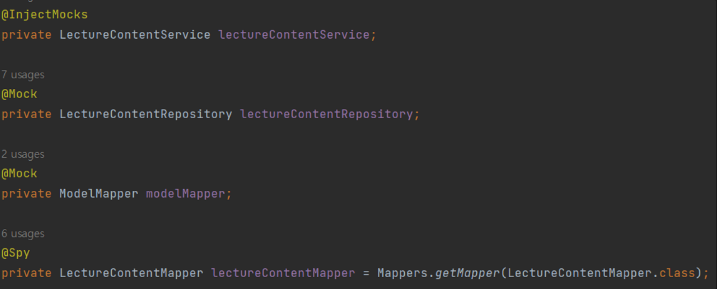 위 사진에서 보면modelmapper 는 Mock으로 설정을 하였다.