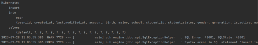 MySQL 로 테스트를 돌릴때는 정상적으로 잘 돌아갔다. 그런데 H2 DB 로 바꾸자마자 Syntax Error 가 발생하였다.