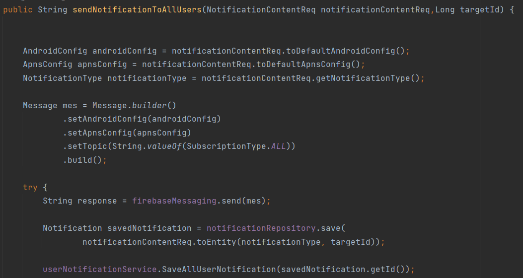 FCM key 를 이용한 인증, Andorid,Apns config 생성, 알림 전송 , 알림 관련 CRUD 로직들이 전부 들어가 있었다.