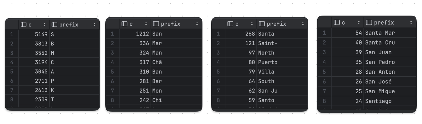 SELECT COUNT(*) AS c, left(city,3) as prefix