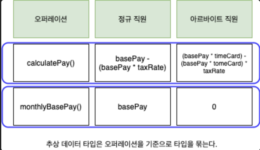 추상 데이터 타입이 오퍼레이션을 기준으로 타입을 묶는다면 객체 지향은 오퍼레이션을 기반으로 타입을 묶는다.